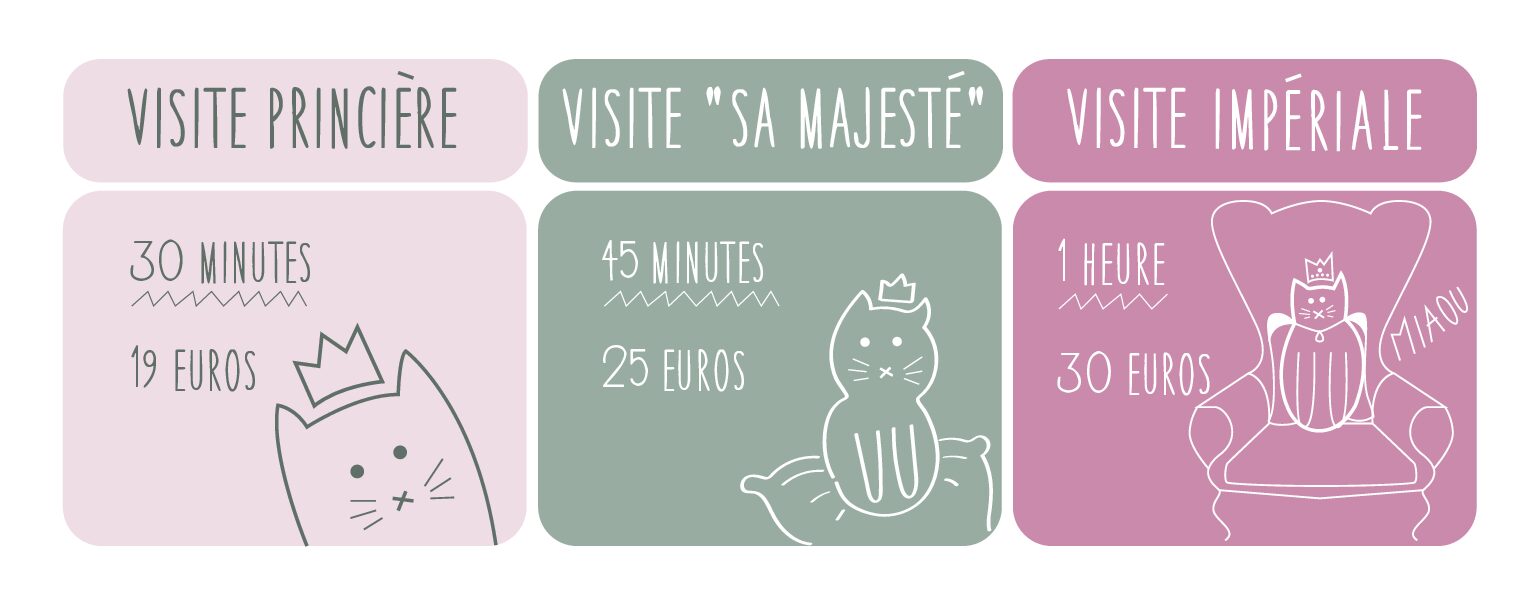 Afin d’assurer un service de qualité et d’avoir le temps de s’occuper de chaque chat individuellement, les visites de 30 et 45 minutes sont valables pour 1 à 3 chats. Des visites de 1 heure seront d’application de 4 chats à 7 chats. Plus de chats, sur devis.